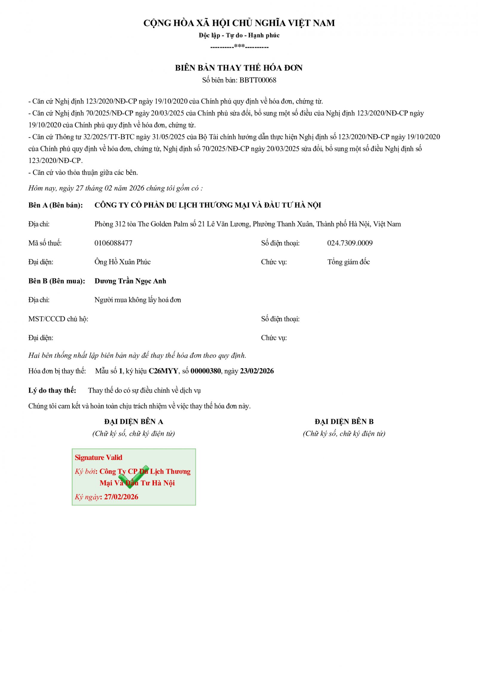 Thông báo thay thế hóa đơn 00000380